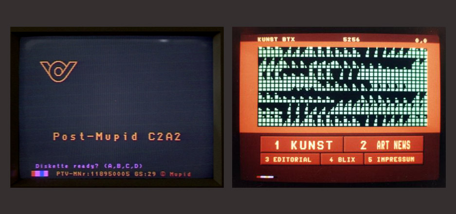 Für die Generierung von Kunst BTX wurde der MUPID eingesetzt. Es war der erste Computer, der sich sowohl von seinen Farben als auch von der Darstellungsart her mit heutigen Rechnern vergleichen läßt. Er konnte - gemeinsam mit dem dazugehörenden Modem - bei der Post gemietet und mit der Telefonleitung verbunden werden. Text- und Bildaustausch waren gleichermaßen möglich. Kunst-BTX war über ein halbes Jahr im Netz und hat bei den wenigen Nutzenden, die es damals gab, großen Anklang gefunden. Heute erinnert die visuelle Codierung bereits an Websites.
