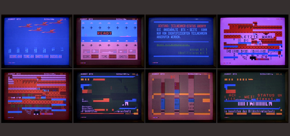 Für die Entwicklung von Kunst BTX wurde ein eigenes Format generiert. Das bedeutete damals, dass die gesamte Oberfläche Zeichen für Zeichen programmiert wurde. Der dem BTX eigene dynamische Seitenaufbau erlaubte dabei eine Online-Übertragung von Computeranimationen. Diese Art des “Streaming” kennen wir heute nicht mehr. Mit derselben Technologie entstand in der Folge das Projekt für die Biennale in Venedig 1986 (• Imaginator •). In DUCKS nimmt Zelko Wiener Entwicklungen der Code-Art eindeutig vorweg.
